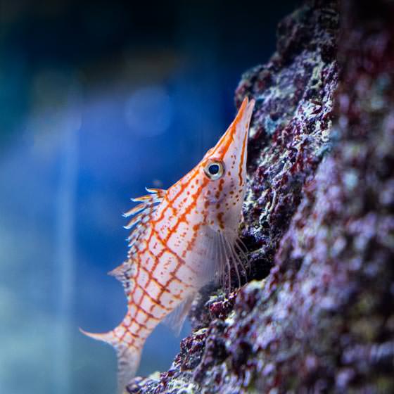 Le poisson faucon écossais se pose presque exclusivement sur des gorgones de couleur rouge orangé dans lesquelles il se cache facilement.